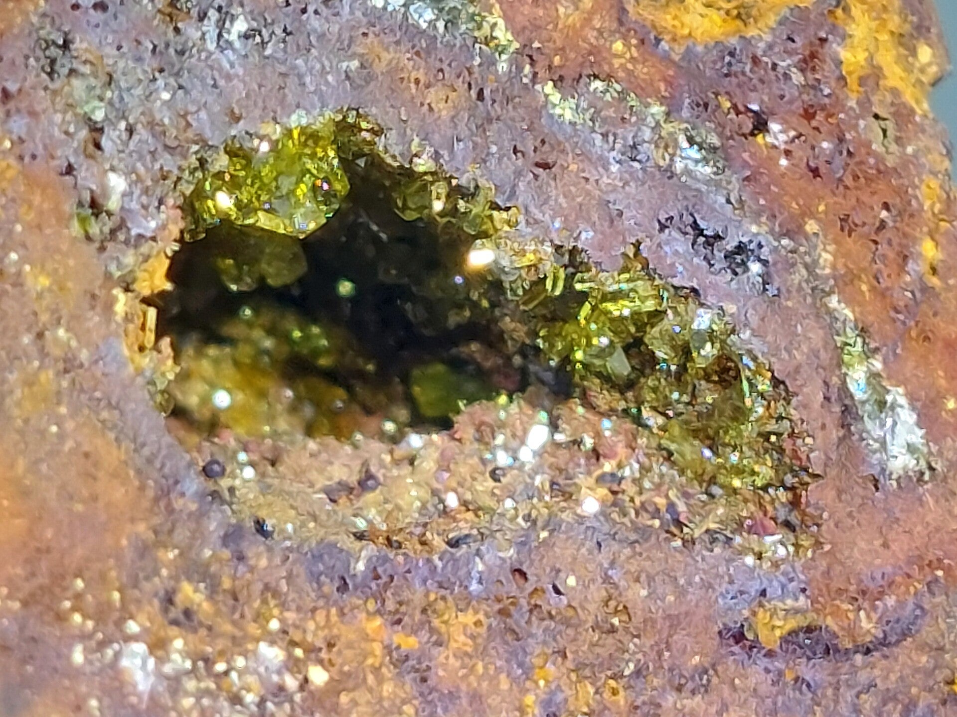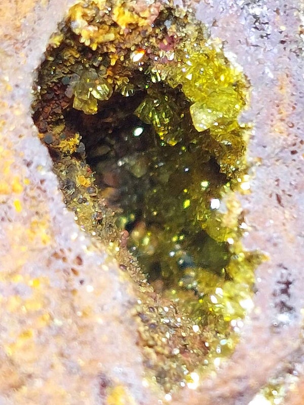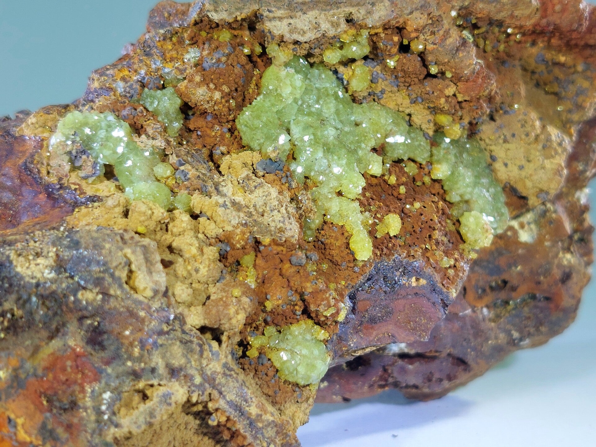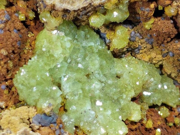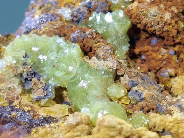 Omschrijving: Opvallende, glanzende groene adamietkristallen domineren de contrasterende, bruine limonietmatrix. De kristallen variëren van transparant tot doorschijnend en vertonen de karakteristieke glasglans die dit mineraal zo geliefd maakt. De combinatie van het felgroene zinkarsenaat op de aardse, donkere matrix zorgt voor een uitzonderlijke visuele dynamiek.