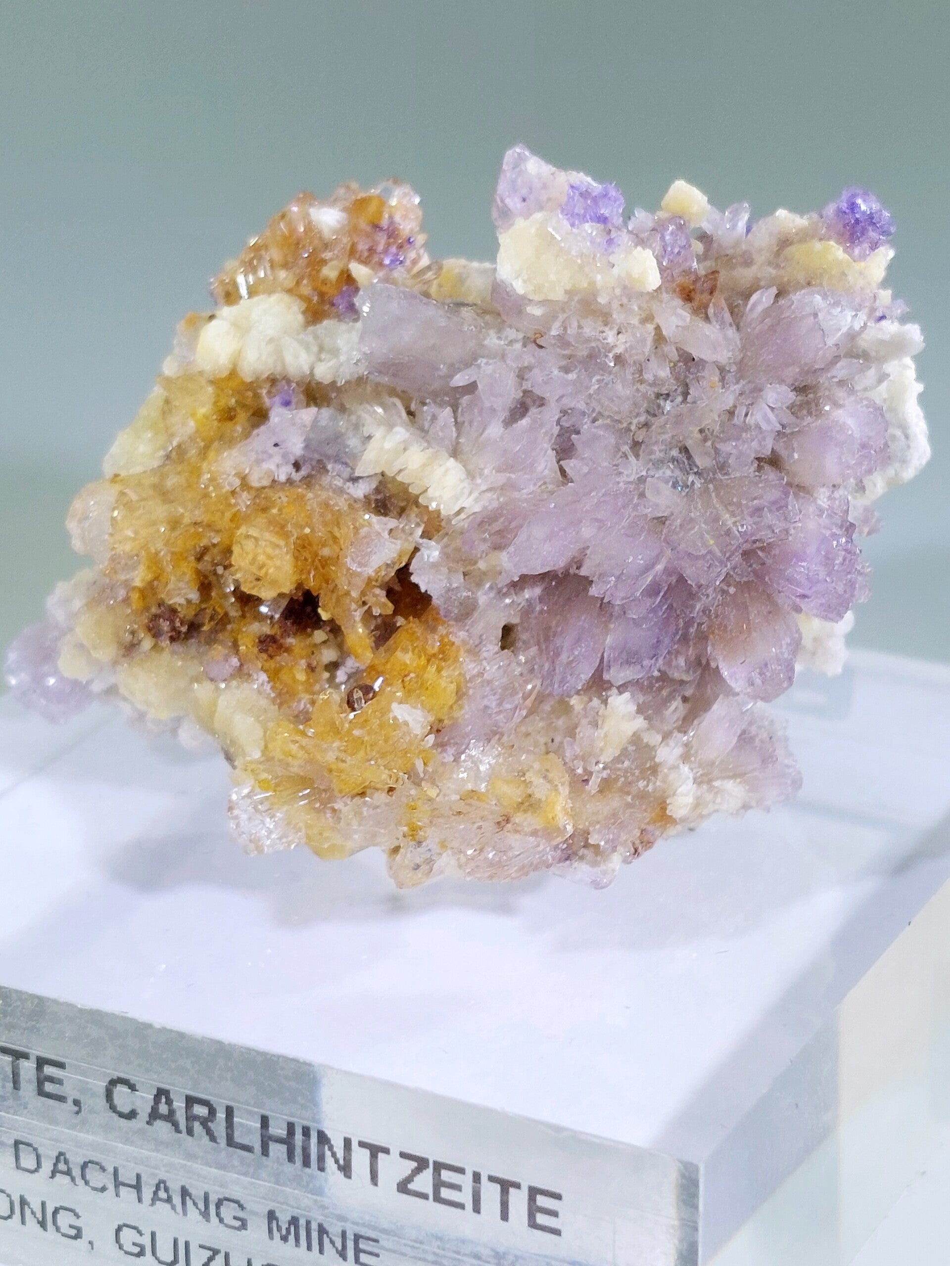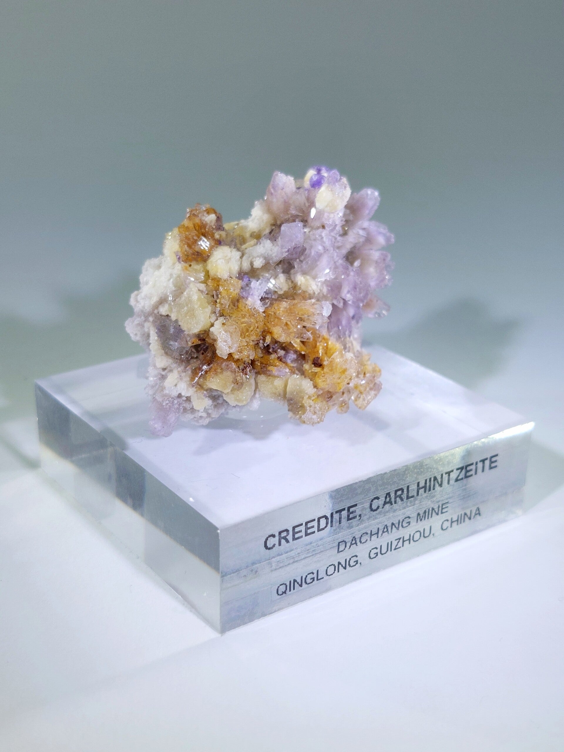Omschrijving: Dit zeldzame verzamelstuk uit de Qinglong Antimony Mine in de Chinese provincie Guizhou vormt een spectaculaire combinatie van esthetiek en mineralogische zeldzaamheid. Het specimen toont een rijk cluster van dieppaarse tot lila Creediet-kristallen, die bekendstaan om hun scherpe, naaldachtige structuur en glasachtige glans. De transparantie van de Creediet is uitstekend, waardoor het licht diep in de kristalgroepen doordringt en de natuurlijke kleurverzadiging accentueert. Dit is een hoogwaardig "systematic" specimen dat zowel door zijn visuele aantrekkingskracht als door zijn wetenschappelijke waarde een prominente plek in elke mineralencollectie verdient.