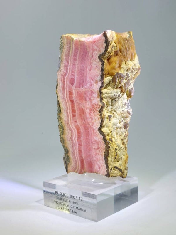 Omschrijving: Dit imposante stuk Argentijnse Rhodochrosiet is een prachtig voorbeeld van natuurlijke schoonheid gecombineerd met vakmanschap. Het dikke exemplaar toont de volledige karakteristiek van de vindplaats: de zijkanten zijn in hun ruwe, authentieke staat gelaten zoals het mineraal uit de aarde komt, inclusief een subtiele zijde die bedekt is met een lichte laag fonkelende pyriet. Terwijl de boven- en achterzijde hun natuurlijke, ruwe textuur behouden, is de voorzijde hoogwaardig gepolijst om de adembenemende interne structuur te onthullen. Door de karakteristieke gelaagdheid van zachte roze en witte banden krijgt het stuk de iconische uitstraling van een 'plak spek', wat de organische rijkdom van dit Zuid-Amerikaanse topstuk benadrukt.