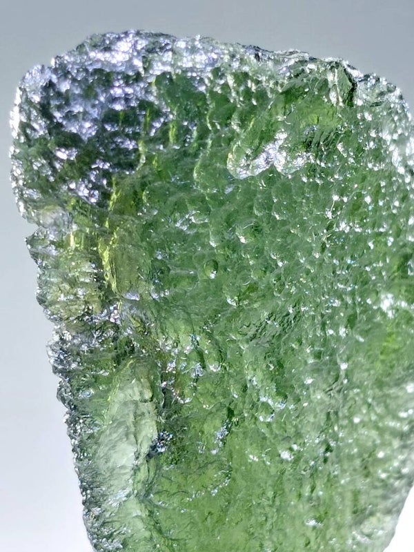 Omschrijving: Voor de verzamelaar die uitsluitend genoegen neemt met het absolute topsegment, presenteren wij een uitzonderlijk exemplaar van maar liefst 97 gram. In de wereld van de Moldaviet is een gewicht van deze omvang een zeldzaamheid die slechts zelden op de markt verschijnt. Dit imposante stuk is geen product van aardse kristalgroei, maar een zeldzame tektiet die ontstond tijdens een catastrofale meteorietinslag ongeveer 14,7 miljoen jaar geleden. De enorme energie van de inslag in de Nördlinger Ries-krater smolt het aardse gesteente en slingerde het hoog de atmosfeer in, waarna het als vloeibaar glas neerkwam in de regio van de Moldau in het huidige Tsjechië.