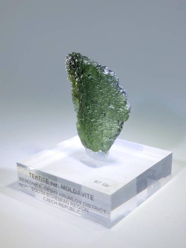 Dit specifieke stuk van 97 gram is een zwaargewicht binnen de categorie impactglas en toont de brute kracht van dit geologische proces. De karakteristieke olijfgroene gloed en de diepe, complexe sculpturing van het oppervlak zijn door de decennia heen gevormd door natuurlijke etsing in de Boheemse bodem. Wetenschappelijk gezien is dit exemplaar een studieobject op zich; de interne structuur met lechatelieriet-insluitsels en de typische gasbelletjes onder lage druk vormen het onomstotelijke bewijs van zijn kosmische ontstaansgeschiedenis en de stolling in de ijle bovenste lagen van onze atmosfeer.