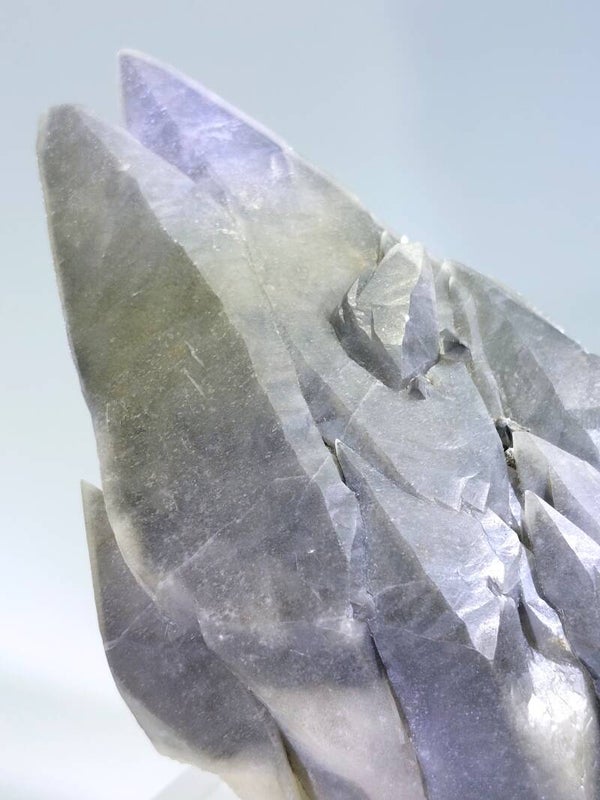 Wat dit stuk werkelijk bijzonder maakt voor de verzamelaar, is de zeldzame combinatie van een dubbeleindige kristalvorm en de fascinerende geschubde textuur. De scalenoëdrische kristallen vloeien naadloos in elkaar over, waarbij het oppervlak een complex patroon vertoont dat doet denken aan een drakenhuid. Dankzij het subtiele verloop van rookgrijs naar lichte tinten krijgt het mineraal een bijna tastbare diepte, terwijl de dubbele terminaties getuigen van een ongestoorde kristalgroei.
