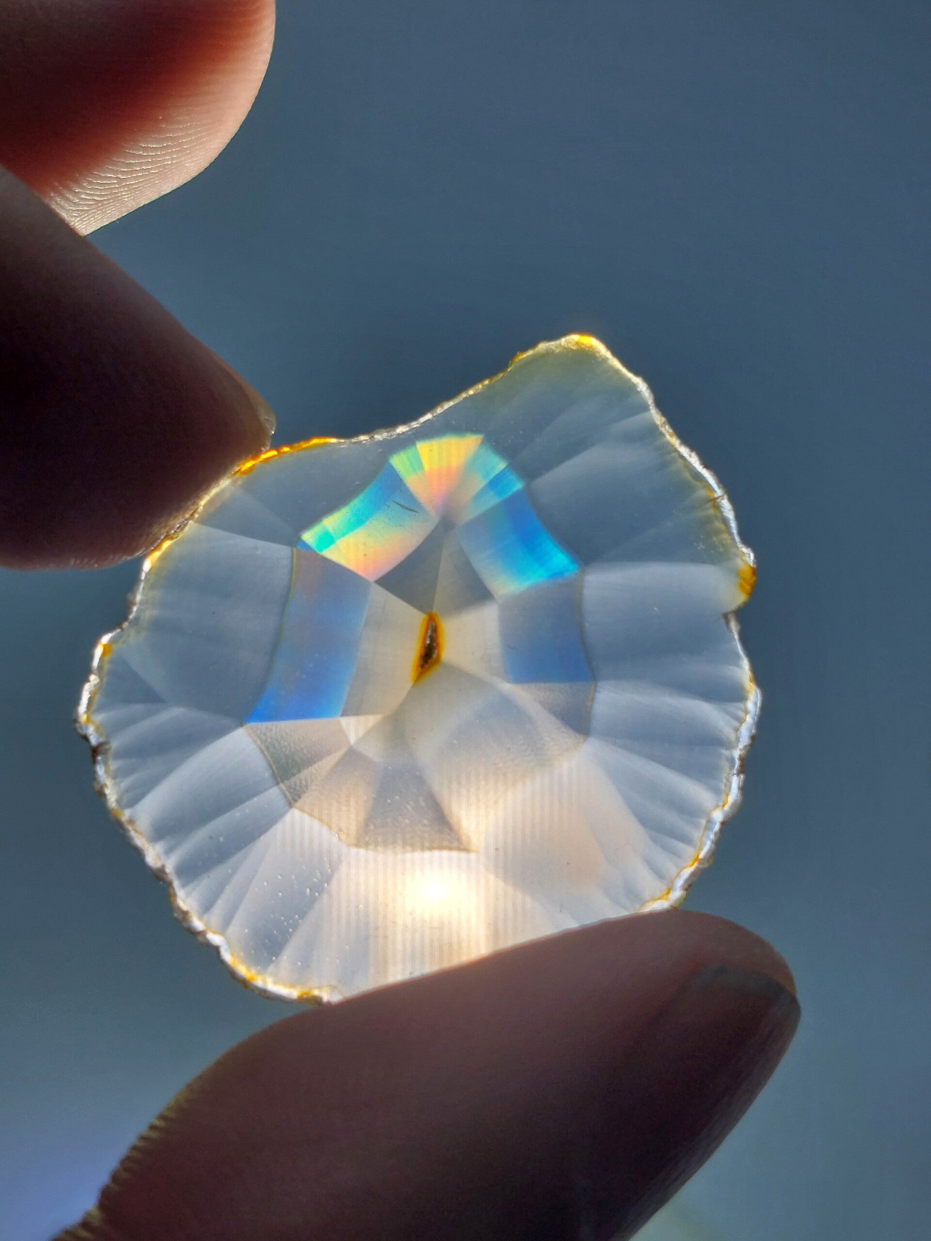 Omschrijving: Op het eerste gezicht lijkt deze agaat uit de weelderige gebieden van Indonesië misschien een bescheiden, prachtig gelaagde steen, maar zodra het licht er onder de juiste hoek doorheen valt, onthult zich een spectaculair natuurverschijnsel. De Iris Agaat dankt zijn naam aan de flinterdunne, microscopische banden die werken als een natuurlijk prisma. Wanneer je de steen tegen een sterke lichtbron houdt, breekt het licht in een levendige regenboog die over de ragfijne kristalstructuren danst.
